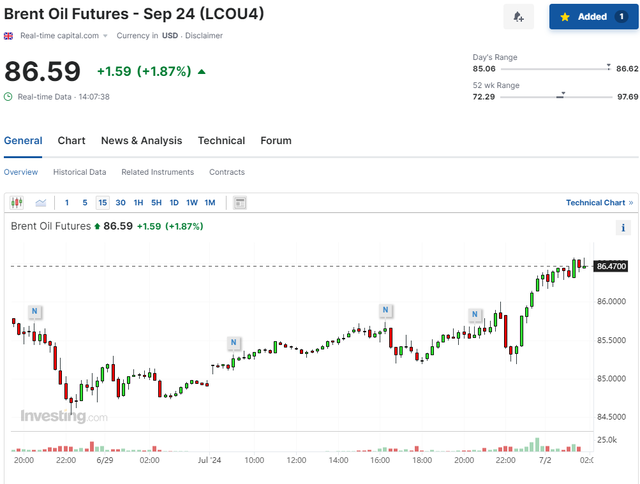 周一隔夜,布伦特原油期货价格接近每桶87美元,逼近2个月以来新高。