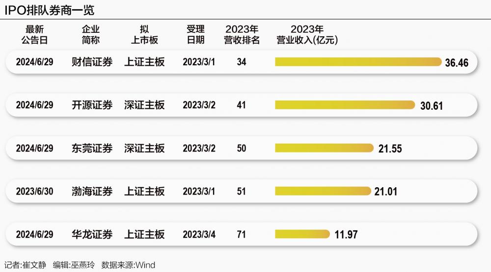 伴随华宝证券撤回材料,目前仍在冲刺IPO的券商还剩5家,包括财信证券、开源证券、东莞证券、渤海证券和华龙证券。上述5家券商2023年营业收入排名位列第34名至第71名之间。